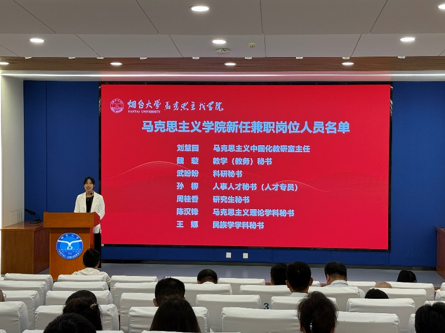 建设和改革提质年工作部署,加快推进高质量内涵式发展,深入实施“揭榜挂帅”制度,根据学院教师内部兼职管理办法,经个人申报和学院党总支会议研究,聘任刘慧园、魏璇、贾维军等11人为教研室主任、学院工作秘书和中心主任。学院党总支书记李祎为他们颁发了聘书。新任科研秘书武盼盼作为新任兼职教师代表做了表态发言,表达了为学院科研工作服务的决心与信心。